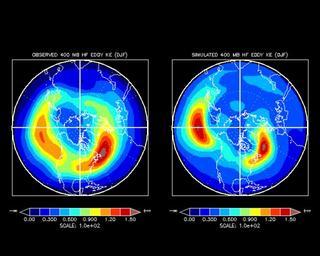 Keywords: Stormtrack.gif Observed left and simulated right 400 mb high-frequency eddy kinetic energy for Dec-Feb Units are m 2 s -2 The observations are calculated from 1-8 day high-pass filtered winds for the nine winter period starting in December 1984 The simulation comes from the solution of a linear stochastically forced two-level model using a basic state consisting of Dec-Feb averaged winds for the period 1984-1993 www cdc noaa gov/cdc/plans/9596/stormtrack html 1984-12 NOAA-CIRES Climate Diagnostics Center Low pressure systems Mean meteorological data PD-USGov |