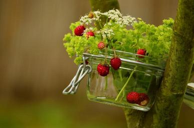 Keywords: strawberries wild strawberries walder berries frauenmantel bouquet glass fruits ripe summer still life decoration jar of course garden