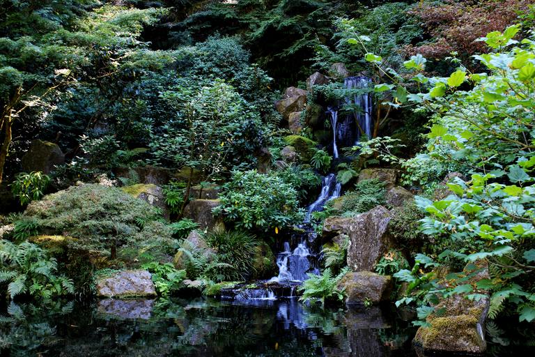 Keywords: stream waterfall zen landscape creek outdoor scenery flow tranquil nature water green scenic garden japanese pond reflection