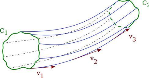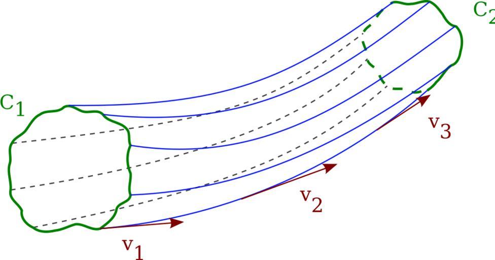 | Keywords: Streamlines and streamtube.svg Streamlines in blue and gray are forming a streamtube some of the velocity vectors are indicated in red v1 v2 v3 and are tangential to one of the streamlines surfaces closing the streamtube C1 C2 are indicated in green own Image based on now-deleted File Streamlines and streamtube png Inkscape 2008-01-30 Twisp SVG physics Field lines in fluid dynamics Streamtubes fluid dynamics | ||||