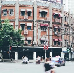 Keywords: street city movement bustling busy intersection traffic pedestrian corner buildings urban