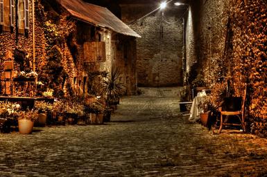 Keywords: street lane night old pavement pierre floor lamp colors facade