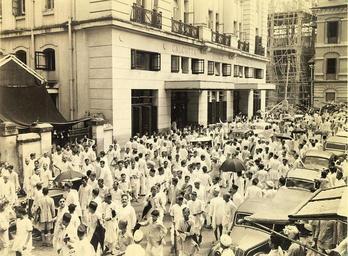 Keywords: Street scene outside the Calcutta stock exchange in 1945.jpg Street scene outside the Calcutta stock exchange The noise is similar to the bedlam in all word exchange and many transactions unofficial take place in the street as shown here The South Asia Section of the Van Pelt Library University of Pennsylvania recently acquired from a bookdealer a photograph album consisting of 60 photographs of Calcutta taken most likely between 1945-1946 The photographer Mr Clyde Waddell also provided the interesting glosses accompanying each photograph Several attested copies of this work has emerged including one with a 'title page' held by the Southeastern Louisiana University in Hammond Louisiana Mr Waddell was a military photographer Many of his captions sound like annotations that would be found in a typical military magazine The album begins with several general long shots of Calcutta and ends with a picture of dhobi-s washermen washing clothes The text accompanying the last photograph also sounds as if the author intended to finish with that picture of one of the great mysteries of India The annotations have been included because of their intrinsic interest not only to the photographs but to a 'typical' American impression of India at this time 1945 http //www library upenn edu/collections/sasia/calcutta1947/ Clyde Waddell other versions PD-USGov Van Pelt Library University of Pennsylvania - Clyde Waddell Calcutta 1940's photos Uploaded with UploadWizard Stock exchanges |