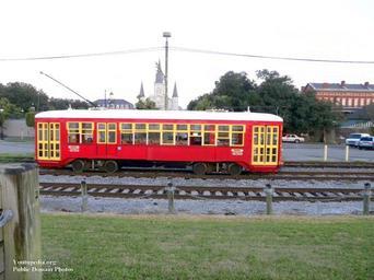 | Keywords: Streetcar by mississippi river side.jpg Riverfront Streetcar in New Orleans View towards Jackson Square from the Mississippi River side own Youtupedia watermark New Orleans 400 series streetcars Number 459 on trams Side views of trams Trams on ties-and-ballast rail tracks |