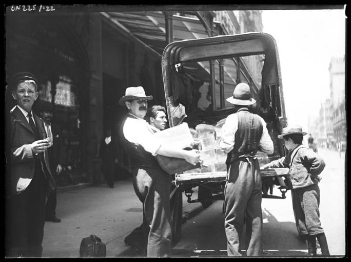 Keywords: blackandwhite people monochrome black and white Streetscenes including pedestrians on King Street, George Street, Pitt Street, plus horsedrawn vehicles and activities on York and Castlereagh Streets, including the delivery of ice, bottle and gas cylinders. Format: Glass photonegative Find more detailed information about this photographic collection: acms.sl.nsw.gov.au/item/itemDetailPaged.aspx?itemID=404293 From the collection of the State Library of New South Wales www.sl.nsw.gov.au Streetscenes including pedestrians on King Street, George Street, Pitt Street, plus horsedrawn vehicles and activities on York and Castlereagh Streets, including the delivery of ice, bottle and gas cylinders. Format: Glass photonegative Find more detailed information about this photographic collection: acms.sl.nsw.gov.au/item/itemDetailPaged.aspx?itemID=404293 From the collection of the State Library of New South Wales www.sl.nsw.gov.au |