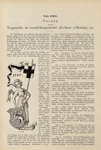 | Keywords: Ströhl Heraldischer Atlas t39 1.jpg  Hugo Gerhard Ströhl Heraldischer Atlas Stuttgart 1899 Tafel 39 Proben aus den Wappenrollen der Geschlechtergesellschaft Zur Katze in Konstanz 1547 Text http //austria-forum org/wbg/ heraldischeratl00de1899kfu austria-forum org 1899 Creator Hugo Gerhard Ströhl 1919 Heraldischer Atlas Ströhl Coats of arms from Konstanz |