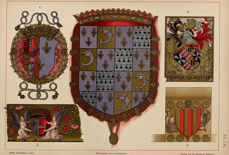 Keywords: Ströhl Heraldischer Atlas t56 2.jpg Hugo Gerhard Ströhl Heraldischer Atlas Stuttgart 1899 Tafel 56 Proben französischer Heraldik aus dem XVI Jahrhundert Copien von Noel Bouton in Paris Tafel http //austria-forum org/wbg/ heraldischeratl00de1899kfu austria-forum org 1899 Creator Hugo Gerhard Ströhl 1919 Heraldischer Atlas Ströhl Coat of arms of the Dauphin of France |
