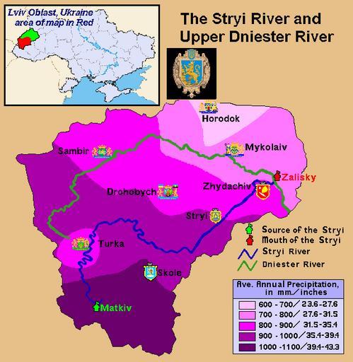 | Keywords: Stryi and Upper Dneistr Rivers.PNG  en This is a map showing the Upper Dniestr River Basin including its main tributary the Stryi River in the southwestern half of the Lviv Oblast in western Ukraine It also shows the average annual precipitation by millimeters and inches for the region and places the administrative centers of each of the raions in this area on the map It includes and inset indicating where this is in relation to the rest of Ukraine and provides the names of the closest villages to the Stryi River's head and mouth I created this map using Microsoft Paint version 7 0 and borrowing data from Google Earth and the 21st European Regional Conference 2005 - 15-19 May 2005 - Frankfurt Oder and Slubice - Germany and Poland report on Floods Modeling in the Upper Dnister River Valley by Ivan Kovalchuk Andriy Mykhnovych Volker Ehlert Jörg Steidl in conjunction with the Leibniz Centre for Agricultural Landscape Research ZALF Germany and held at the Ivan Franko National University of L ™viv Ukraine page4 URL http //www zalf de/icid/ICID_ERC2005/HTML/ERC2005PDF/Topic_2/Kovalchuk pdf 2010-02-10 transferred from en wikipedia SreeBot Saukkomies wikipedia en other versions Saukkomies Original upload log page en wikipedia Stryi_and_Upper_Dneistr_Rivers PNG Upload date User Bytes Dimensions Comment 2010-02-10 01 12 UTC Saukkomies 64995 bytes 631×648 <small><nowiki>I created this map using Microsoft Paint version 7 0 and borrowing data from Google Earth and the 21st European Regional Conference 2005 - 15-19 May 2005 - Frankfurt Oder and Slubice - Germany and Poland report on Floods Modeling in the Upper Dnist</nowiki></small> Stryi River |