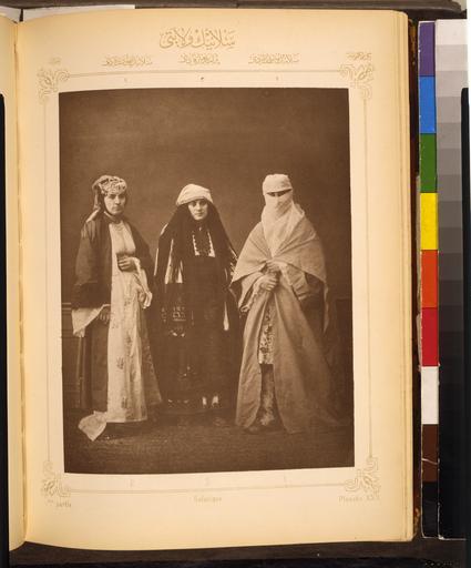 | Keywords: Studio Portrait of Models Wearing Traditional Clothing from the Province of Selanik (Salonica), Ottoman Empire WDL2599.png Artwork ru Лоне а и де fr Hamdi Bey Osman 1842-1910 en Hamdi Bey Osman 1842-1910 zh 劳奈 玛丽娅·德 pt Hamdi Bey Osman 1842-1910 ar حمدي بيك عثمان 1842-1910 es Hamdi Bey Osman 1842-1910 ru Студийный по т ет моделей в т адиционной одежде п овинции Селаник Салоники Оттоманская импе ия fr Portrait en studio de modèles portant les vêtements traditionnels de la province de Selanik Salonique Empire ottoman en Studio Portrait of Models Wearing Traditional Clothing from the Province of Selanik Salonica Ottoman Empire zh 萨罗尼加(萨洛尼卡) 穿传统 饰模特的画室肖像,奥斯曼 国 pt Retrato de Estúdio de Modelos usando roupas tradicionais da província de Selanik Salonica Império Otomano ar صورة شخصية في الاستوديو لعارضين يرتدون ملابس تقليدية من مقاطعة سيلانيك سالونيكا ، الامبراطورية العثمانية ru Паскаль Себа был известным фотог афом создавшем множество фотог афий для своих клиентов как в Османской импе ии так и в западных ст анах Студия Себа составила и выпустила несколько коллекций этног афических фотог афий и фотог афий костюмов некото ые из них были выполнены в сот удничестве с художником и а хеологом Османом Хамди Бей Данная фото еп одукция взята из совместно созданной ими книги под названием <i> Les costumes populaires de la Turquie en 1873 </i> а одные или т адиционные костюмы Ту ции в 1873 году Данный альбом в кото ом описываются этнические костюмы населения всех егионов Османской импе ии был создан по заказу османского п авительства для еждуна одной выставки 1873 года в Вене Создатели альбома Хамди Бей и Викто а и де Лоней п авительственный служащий исто ик-любитель и художник ф анцузского п оисхождения а фотог афии изоб ажены т адиционные костюмы сп ава налево замужней мусульманки из Селаника Салоники ; замужней ев ейки из Селаника Салоники и болга ки из Пе лепе П илеп Во в емена Османской импе ии Салоники ныне Фессалоники Г еция был к упным го одом Согласно данным пе еписи 1913 года численность его населения составляла около 158 тысяч человек 40 тысяч из кото ых были г еками-х истианами 46 тысяч мумульманами и 61 тысяча ев еями <br>Одежда и платье; Г упповые по т еты; По т етные фотог афии; Женщины fr Pascal Sébah était un photographe ottoman prolifique et réputé qui a travaillé à la fois pour des clients ottomans et occidentaux Le studio de Sébah a produit nombre de collections de photographies ethnographiques et de costumes certaines dans le cadre d'une collaboration avec le peintre et archéologue Osman Hamdi Bey Cette épreuve photomécanique est tirée d'une telle collaboration un livre intitulé <i>Les costumes populaires de la Turquie en 1873</i> Costumes folkloriques ou traditionnels de la Turquie en 1873 Cet album représentant les costumes ethniques de l'ensemble de l'Empire ottoman a été commandé par le gouvernement ottoman pour la Foire Internationale de Vienne en 1873 Hamdi Bey et Victor Marie de Launay un fonctionnaire ottoman historien amateur et artiste d'origine française en sont les auteurs La photo montre les costumes traditionnels de droite à gauche d'une femme musulmane mariée de Selanik Salonique d'une femme juive mariée de Selanik Salonique et d'une femme bulgare de Perlèpè Prilep l'époque de l'Empire ottoman Salonique actuelle Thessalonique Grèce était une ville cosmopolite Selon le recensement de 1913 sa population d'environ 158 000 personnes comprenait environ 40 000 chrétiens grecs 46 000 musulmans et 61 000 juifs <br>Vêtements et habits; Portraits de groupe; Portraits photographiques; Femmes en Pascal Sébah was a prolific and well-known Ottoman photographer who worked for both Ottoman and Western clients Sébah s studio produced a number of collections of ethnographic and costume photos some in collaborations with the painter and archaeologist Osman Hamdi Bey This photomechanical print is drawn from one such collaboration a book entitled <em>Les costumes populaires de la Turquie en 1873</em> Folk or Traditional costumes of Turkey in 1873 This album depicting ethnic costumes from throughout the Ottoman Empire was commissioned by the Ottoman government for the 1873 International Fair in Vienna and was authored by Hamdi Bey and Victor Marie de Launay an Ottoman official amateur historian and artist of French origin The photo depicts the traditional costumes of from right to left a married Muslim woman of Selanik Salonika ; a married Jewish woman of Selanik Salonika ; and a Bulgarian woman of Perlèpè Prilep In Ottoman times Salonika present-day Thessaloniki Greece was a cosmopolitan city According to the 1913 census its population of approximately 158 000 people included around 40 00