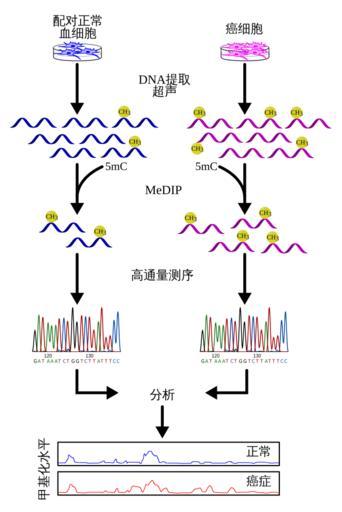 Keywords: Study-flow (zh-cn).svg en This is a workflow that demonstrates the general strategy in a MeDIP-seq experiment Particularly the example investigates cancer as a general source of disease condition; however the starting source can range from different tissue types or different time points This diagram outlines very briefly the steps in MeDIP-seq including the use of software for aligning short reads depicted at the High-throughput Sequencing step At the anlysis stage a graph can be used to visualize and compare methylation levels between experimental sample i e cancer/disease state tissue-specific time-specific etc and the control i e normal/blood cells baseline time-point normal tissue etc The peaks show in the plot can essentially represent the frequency or short reads that have been aligned to the particular region in the genome The more reads that cover a particular region then the higher the methylation level This can be explained by MeDIP having enriched for methylated DNA at this region The plot and data in this diagram is entirely simulated and does not represent real MeDIP-seq data; this is to simply display typical visualization that can be used during MeDIP-seq analysis Study-flow jpg 50 2013-06-15 17 04 UTC Study-flow jpg Gavinha derivative work Shakiestone svg Study-flow jpg Biochemistry methods Diagrams illustrations and schemas concerning cancer DNA methylation