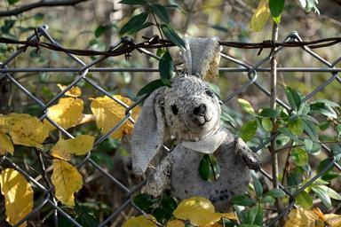 Keywords: stuffed animal old forget lost wire mesh fence wire fence fence security barrier symbol demarcation fenced leaves plant autumn imprisoned