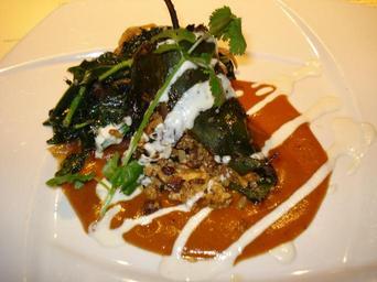 Keywords: Stuffedpoblano.jpg Stuffed Poblano in sweet potato purée and chili sauce with tofu shiitake mushrooms spinach Spanish rice currants almonds served at San Francisco's http //www millenniumrestaurant com/ Millenium Own 2007-11 MPerel Vegetarian food of the United States Poblano Capsicum-based food Spinach-based food Hot sauce |