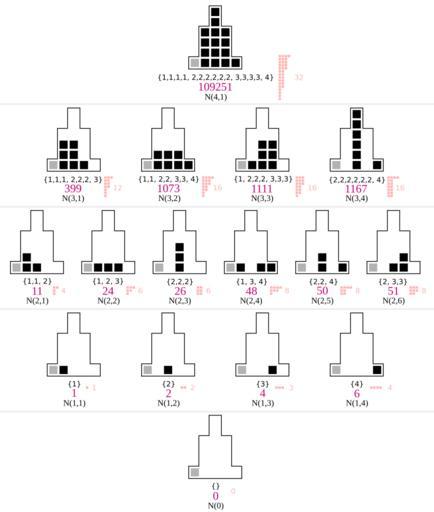 | Keywords: Subgroups of Z2^4; digit weights in equivalence classes.svg v Subgroups of nimber addition Z24 The equivalence classes can be defined by multisets of their positive digit weights <br> They correspond to some integer partitions denoted by their index in A194602 shown in violet <br> Compare right column in this table The higher indices are taken from https //oeis org/A194602/a194602 txt this table where the values are +1 The 1 4 6 4 1 pattern in the vertices is from Pascal's triangle the 1 4 6 4 1 pattern of the whole structure is from A076831 own Mate2code Subgroups of nimber addition Binomial coefficients Integer partitions Cc-zero |