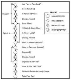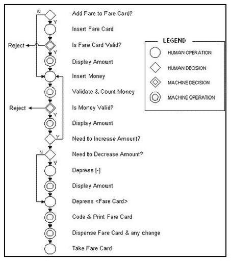 Keywords: Subway Fare Card Machine Flow Process Chart.jpg en Subway Fare Card Machine Flow Process Chart Flow Process Charts - These charts are used to depict the sequence of operator activities or information transfer as part of a system A Flow Process Chart FPC is vertically oriented and can be annotated on either side with a time scale if the data is available These charts are developed to detail operator tasks and incorporate human and machine decision points http //www hf faa gov/webtraining/Usability/u19_tools3 htm faa gov webtraining FAA 2008 PD-USGov Flow process charts |