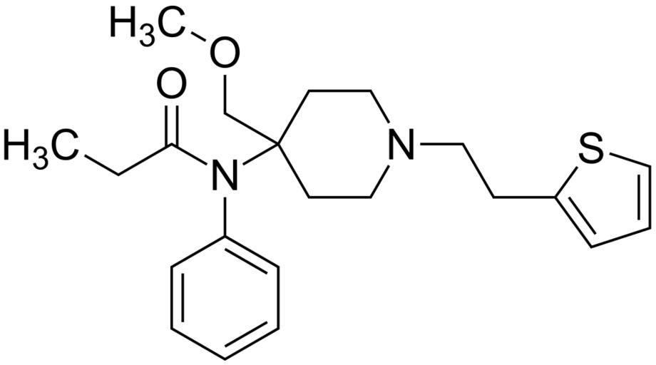 | Keywords: Sufentanil 200.svg validSVG Structure of N- 4- methoxymethyl -1- 2- thiophen-2-yl ethyl piperidin-4-yl -N-phenylpropionamide Own 2014-04-17 Emeldir <span class signature-talk >talk</span> Chemical structure verified https //upload wikimedia org/wikipedia/commons/d/d0/Sufentanil_200 svg 1S/C22H30N2O2S/c1-3-21 25 24 19-8-5-4-6-9-19 22 18-26-2 12-15-23 16-13-22 14-11-20-10-7-17-27-20/h4-10 17H 3 11-16 18H2 1-2H3 GGCSSNBKKAUURC-UHFFFAOYSA-N 56030-54-7 Synonyms <small>N- 4- Methoxymethyl -1-2- 2-thienyl ethyl-4-piperidyl propionanilide N- 4- Methoxymethyl -1-2- 2-thienyl ethyl-4-piperidyl propionanilide citrate Chronogesic DEA No 9740 HSDB 6760 N-2- 2-thienyl ethyl-4-piperidinyl-N-phenylpropanamide N-2- 2-thienyl ethyl-4-piperidinylpropionalnalide N-2- 2-thienyl ethyl-4-piperidylpropionanilide R-30730 R-33800 Sufenta Sufentaniili Sufentaniilisitraatti Sufentanil Sufentanil Citrate Sufentanil citrát Sufentanil Sitrat Sufentanil citrate de Sufentanili Citras Sufentanilio citratas Sufentanilis Sufentanilo Sufentanilo citrato de Sufentanilum Sufentanyl Szufentanil Szufentanil-citrát</small> PD-chem Sufentanil |