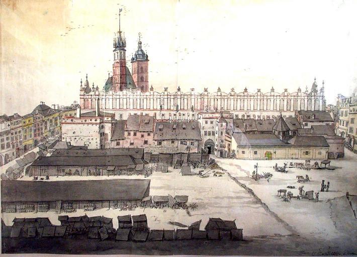| Keywords: Sukiennice kramy syndykowka 1830.jpg en Cloth Hall in Cracow in 1830 pl Zachodnia część Rynku Głównego Sukiennice Syndykówka i kramy przed wyburzeniem Mal Teofil Piątkowski 1830 r Ze zbiorów Muzeum Historycznego m Krakowa http //www wodadlazdrowia pl/pl/9295/0/Zrodlo_w_rynku_w_Krakowie html Teofil Piątkowski 1830 PD-old-100 Historical Museum in Kraków |
