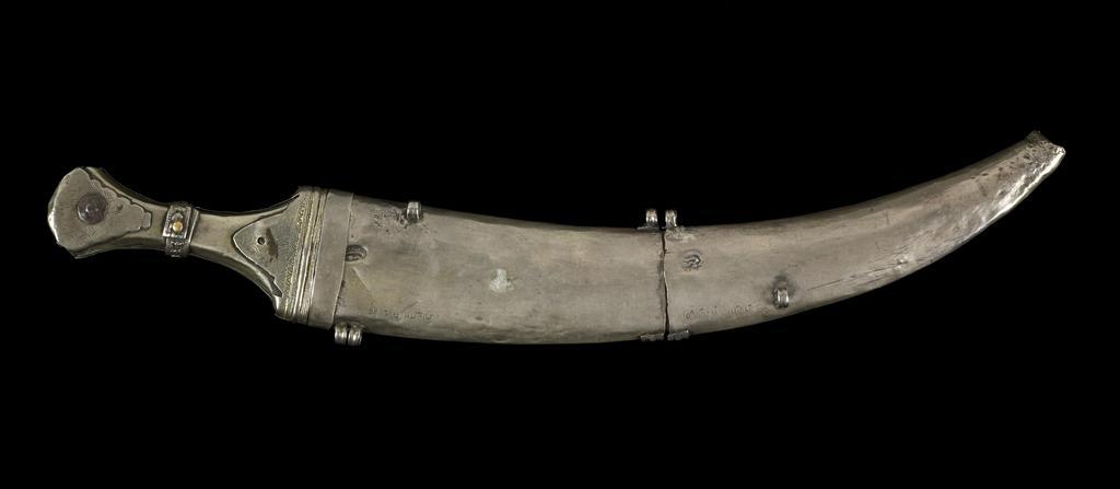 | Keywords: Sulayman Salih - Thuma - Walters 511451 - Back.jpg The sheath is created from two pieces each with a buckle at the end and several loops on the side and back for attaching it to the girdle The front of the sheath is decorated with an arabesque leaves and tendril pattern The blade is fixed in the wooden handle with two pins which end in round decorative plaques made from coins Between the two plaques is a rhombic-shaped element on a band which closes at the back The back of both parts of the sheath have each an Arabic stamp with the date nusfi 1267; nusfi means half This date belongs either to the reign of al-Mutawakkil Ali AH 1267 or al-Mansur Ahmad AH 1266-1267 An engraved Hebrew inscription names the silversmith Sulayman Salih mahasit The term mahasit means half 1267 AH/AD 1850-1851 silver with gilding and wood Overall L 22 1/16 x W 16 1/8 in 56 x 41 cm ; L of blade 11 x W of blade 18 7/8 in 28 x 48 cm accession number 51 1451 80932 Mr Benjamin Zucker Zucker Family Trust and Mr Derek Content New York and London by purchase Walters Art Museum Joint gift to the Walters Art Museum Baltimore and the Israel Museum Jerusalem by Mr Benjamin Zucker and Mr Derek Content in honor of Mrs Barbara Zucker and Mrs Amanda Content 2010 Stamp Arabic nusfi 1267 Engraving Hebrew Sulayman Salih mahasit place of origin between Taizz and Sana'a Walters Art Museum license Weapons in the Walters Art Museum South Arabian art in the Walters Art Museum Sulayman Salih Media contributed by the Walters Art Museum needs category review |