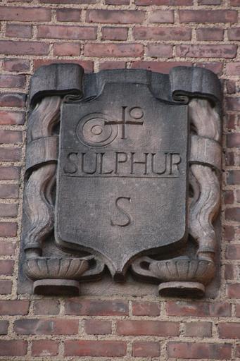 Keywords: Sulfur at Sterling Chemistry Laboratory of Yale.JPG en Two different symbols for Sulfur on the fassade of Sterling Chemistry Laboratory of Yale University in New Haven CT USA own 2012-05-17 Saalebaer Sulfur Science Hill Cc-zero