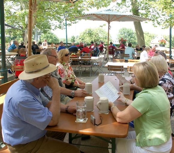 Keywords: summer beer garden celebrate human beer dining tables sit chairs benches cozy eat drink after work rest leisure outside catering