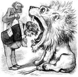 Keywords: Sumner Lion.png en Charles Sumner puts his head in the gaping mouth of a lion while holding papers relating to the investigation that U S violated its neutral obligations by selling arms to France during the Franco-Prussian War of 1870 In his pocket are papers relating to U S claims against Great Britain for violating its neutral obligations by outfitting privateers during the Civil War Alabama claims Carl Schurz looks on anxiously in the background Harper's Weekly Creator Thomas Nast March 9 1872 p 200 Caption PUTTING HIS HEAD IN THE BRITISH LION'S MOUTH Why did he seek this counsel It was to prove that our Government had violated its neutral obligations to Germany to embroil us in a diplomatic difficulty with that Power and to prejudice our own case with the tribunal at Geneva by showing that we sinned as gravely against Germany as England sinned against us in the time of the Rebellion ” N Y Herald Feb 21 1872 PD-old-100 Caricatures of Carl Schurz Charles Sumner Thomas Nast 1872 in the United States 1872 cartoons 1870s political cartoons of the United States Drawings of lions People with lions in art |