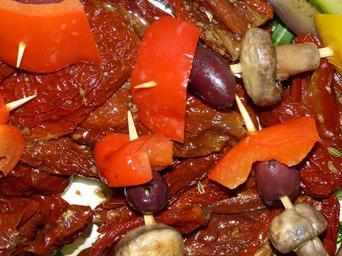 Keywords: sun dried tomatoes antipasti restaurant eat meal gastronomy food delicacy dine gourmet buffet celebration festival starter kitchen paprika sweet peppers vegetarian mushroom olive red pepper