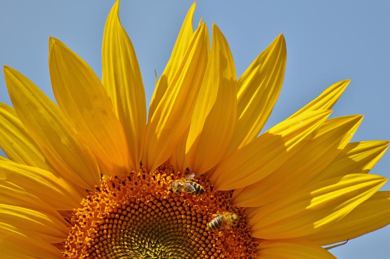 Keywords: sun flower bees summer garden blossom bloom yellow insect helianthus nature pollination close pollen macro sunny sun plant helianthus annuus flower seeds