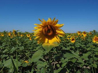 Keywords: sun flower sunflower field helianthus annuus flower nature plant blossom bloom yellow inflorescence beautiful sunny colorful bright tongue flower sky sky blue
