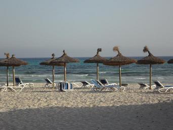 Keywords: sun loungers parasols beach sand beach tourism holiday recovery sun lounger shade tree recover sunbathing travel rest sea ocean mediterranean water sky empty blank abendstimmung mallorca relaxation mood sand coast