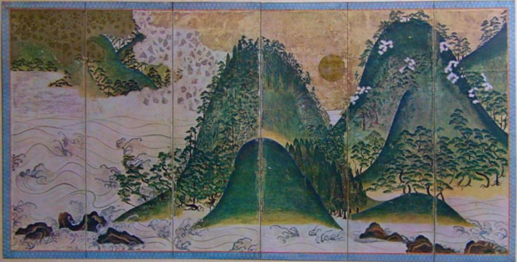 Keywords: Sun and Moon Landscape Kongoji1.jpg en Jitsugetsu sansui-zu Landscape with the Sun and Moon Right Pair of Six Folded Screens Color gold foil on paper 1 47x 3 135m 16th century JAPAN ja 日 山水図 屏風 右双 大阪河内 金剛寺 16世 1 47x 3 135m Anthlogy of Momoyama Screens Nakajima_Taiseikaku Co ACE1934 Author century 16 PD-Art Paintings on screens from Japan Paintings of the Muromachi period Important Cultural Property of Japan in Osaka prefecture |