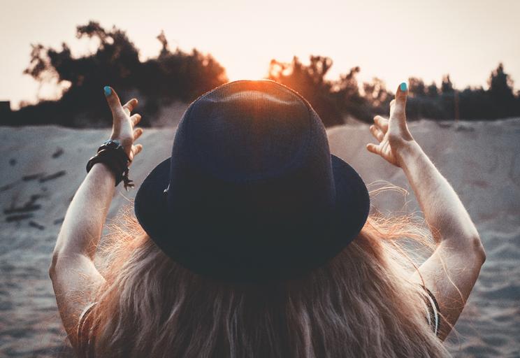 Keywords: sun red sun sunset dawn girl magic closeup nature bright living nature outdoors summer stroll hat hands blonde hair forest