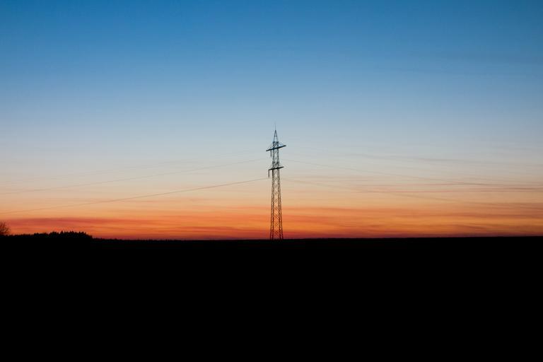 Keywords: sun sunset sunrise dawn afterglow red light current energy sky people eco strommast lines power line power poles line landscape electronics power supply dusk abendstimmung reddish blue twilight evening sky voltage high voltage nature