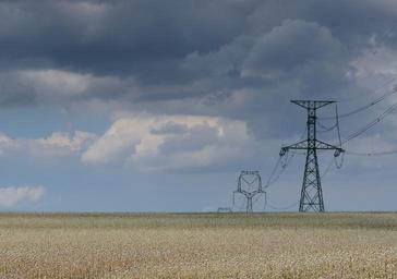 Keywords: sun transmission tower wires lines tall summer industry light fields poppies sky clouds blue