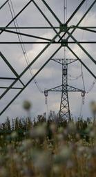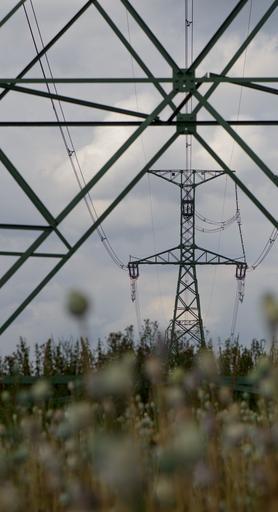 Keywords: sun transmission towers wires lines tall summer industry light fields poppies sky clouds blue