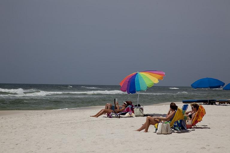 Keywords: sunbathers beach sand white ocean waves umbrella tanning vacation relax people swimsuits relaxation leisure sea water tourism chairs