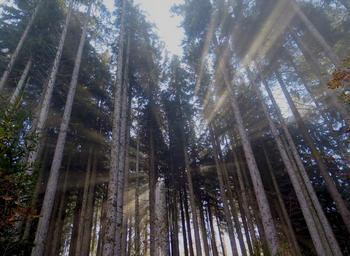 Keywords: sunbeam forest trees fog nature sun autumn morgenstimmung sunlight mood
