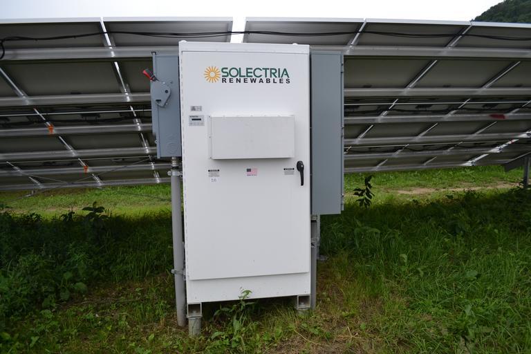 Keywords: SunGen Sharon Solar 12.jpg en SunGen Sharon Solar Farm inverter in Sharon Vermont On one side is the DC disconnect switch and on the other side is the 480 Volt AC disconnect switch There are 19 inverters Total output is 2 2 Megawatts DC although this may be increased by an additional 400 kilowatts There are 9 562 Upsolar UP-M230 polycrystalline panels each with Tigo Energy Maximizers allowing each panel to be separately monitored own SayCheeeeeese 2012-08-11 Solar power in Vermont Cc-zero |