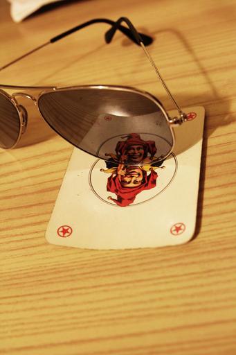Keywords: sunglasses playing card wildcard joker wood table mirror red