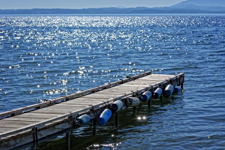 Keywords: sunlight mirroring water lake boardwalk pier wide distant sparkle blue rest mood morning atmospheric relaxation calm recover nature silent landscape chiemsee bavaria web waters atmosphere