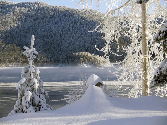 Keywords: sunny winter cold snow ice trees winter day canim lake british columbia canada outdoor landscape scenery winter dream nature