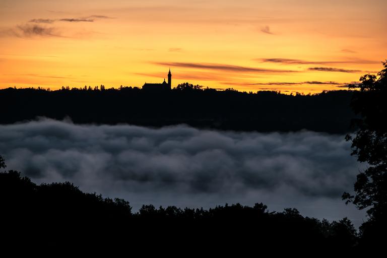 Keywords: sunrise fog clouds ammersee andechs monastery monastery church bavaria germany mood sun lake morgenstimmung morning sun mountains romantic morning hour atmosphere morning fog bank idyll