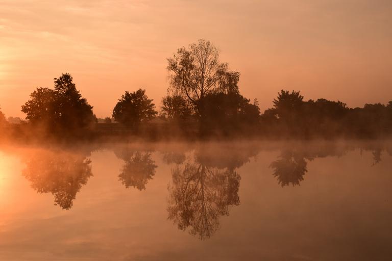 Keywords: sunrise morgenrot skies sun sky dawn light nature mood mirroring lake trees fog beautiful romantic mourning farewell melancholy