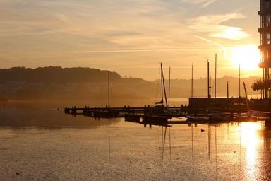 Keywords: sunrise phoenix lake dortmund boats water jetty port ship reflections sunset yacht