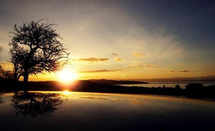 Keywords: sunrise tree black silhouette reflection yellow blue lake constance morning shiny