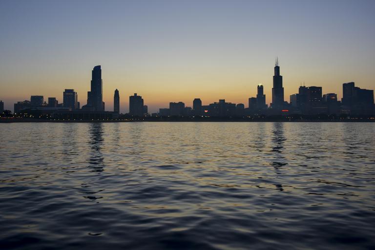 Keywords: sunset buildings skyline architecture water high rises towers dusk night