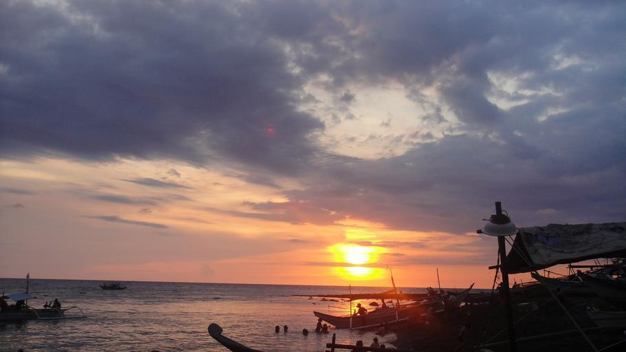 Keywords: sunset clouds nature cloudy sunlight sun rays boat people beach scenery