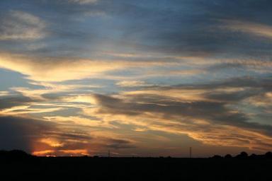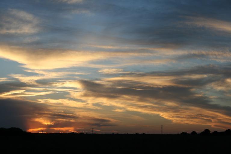 Keywords: sunset clouds white streaked glow orange blue sky dark horizon