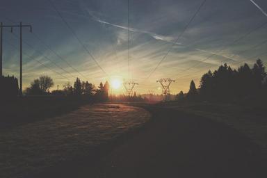 Keywords: sunset dusk sky power lines landscape nature road rural trees