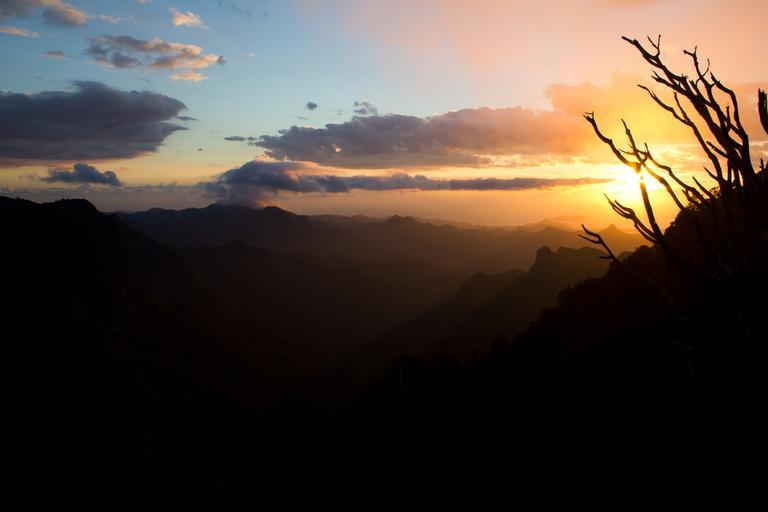 Keywords: sunset forest jungle nature national park sunrise landscape wide angle sky blue orange sun dark trees hills clouds mountains rock woods hiking tramping trekking morning evening dusk vista