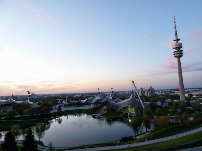 Keywords: sunset munich lake holiday europe olympic park evening tower sky summer