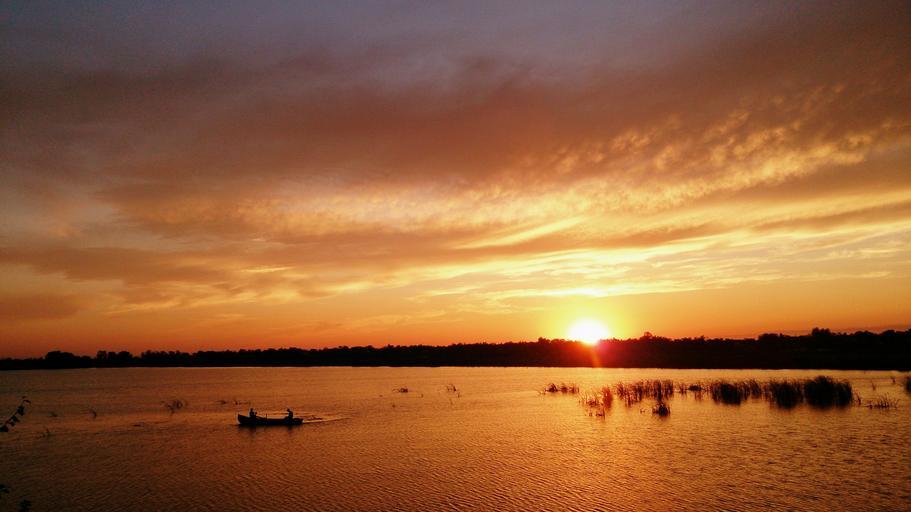 Keywords: sunset orange water ocean sea horizon boat canoe silhouette dusk dawn sunlight clouds dramatic yellow bright morning evening landscape tranquil